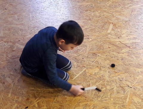 Vyzkoušeli jsme si pohyb rychlobruslařů i krasobruslařů a hlavně otestovali vlastnoručně slepené minihokejky. Stačily nám na to lékařské špachtle, lepenka průsvitná a černá a víčko od PET lahve.