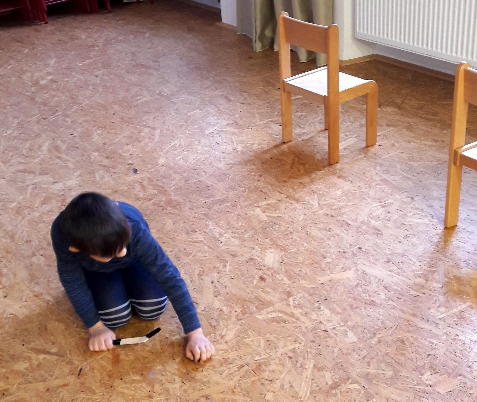 Děti trénovaly střelbu na branku (židličku). Zjistila jsem, že kluci do toho vkládají hodně síly a děvčata mají lepší mušku. Ještě jsme si na čtvrtku namalovali přenosné kluziště, aby děti měly na čem doma hrát náš minihokej.