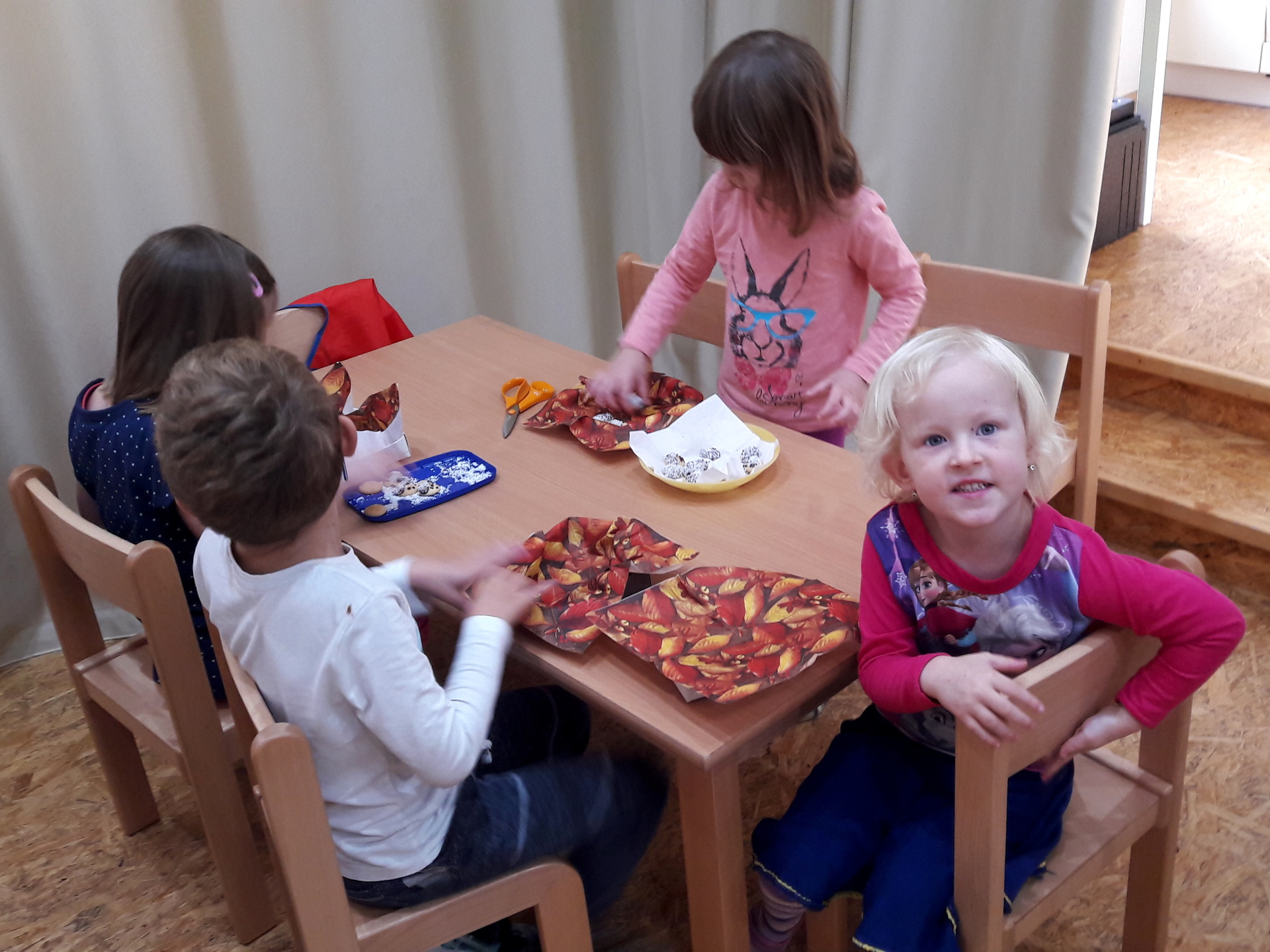 Samozřejmě jsme i ochutnávali a šmakovalo nám. Mňam! Každý si odnášel domů velkou rodinku piškotových ježků hezky zabydlených ve vlastnoručně poskládané krabičce vystlané ubrouskem s dekorem spadaného listí.