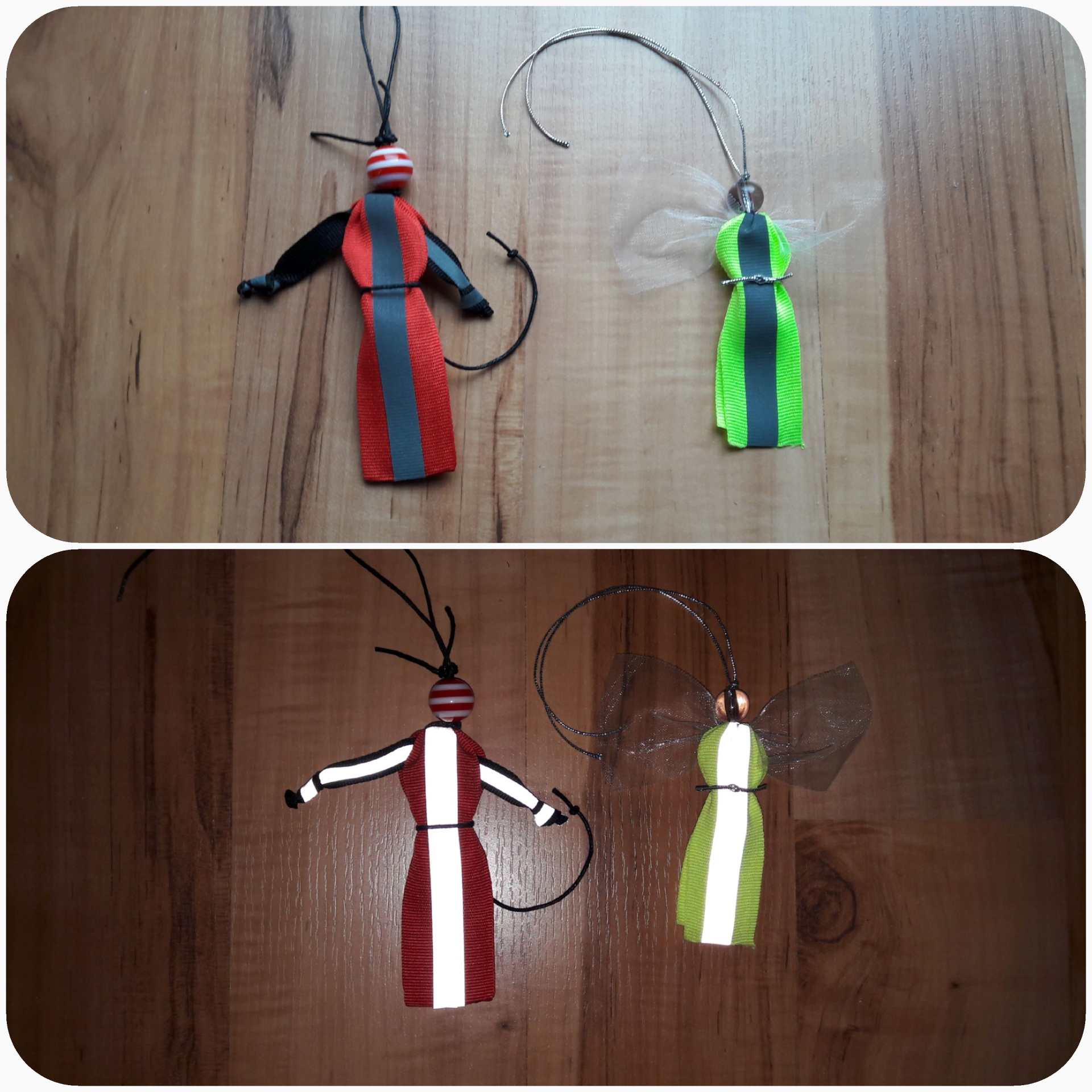 Hned na úvod jsem se dětí ptala, zda doma častěji slyší: "S tebou šijou všichni čerti..." nebo "Jste hodní jako andílci..." Co myslíte? Samozřejmě jsou všichni nejhodnější, proto jsme si čertíky aspoň vyrobili. A dokonce reflexní (z korálků, reflexních textilních pásek a šňůrek). Pro jistotu i podobné andílky.