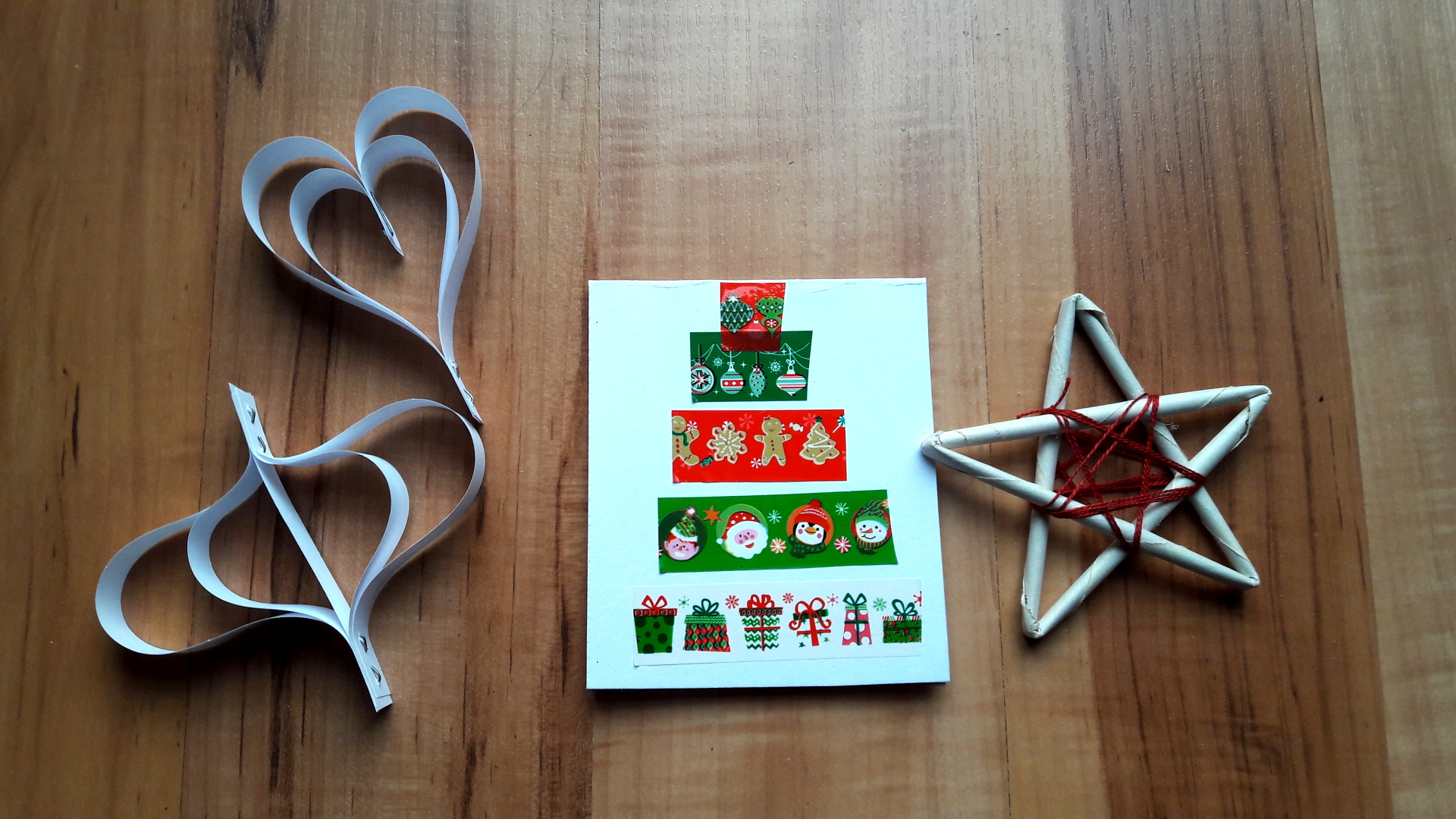 Protože se Vánoce neúprosně blíží, bylo na čase vyrobit tématická přáníčka a ozdoby. Na přáníčka nám stačila jen přeložená čtvrtka, nůžky a velmi vydařené lepicí pásky s vánočními motivy Z Lidlu. Největší úspěch měla páska s panem Perníčkem. Kluci vymysleli i přáníčka zamykací.