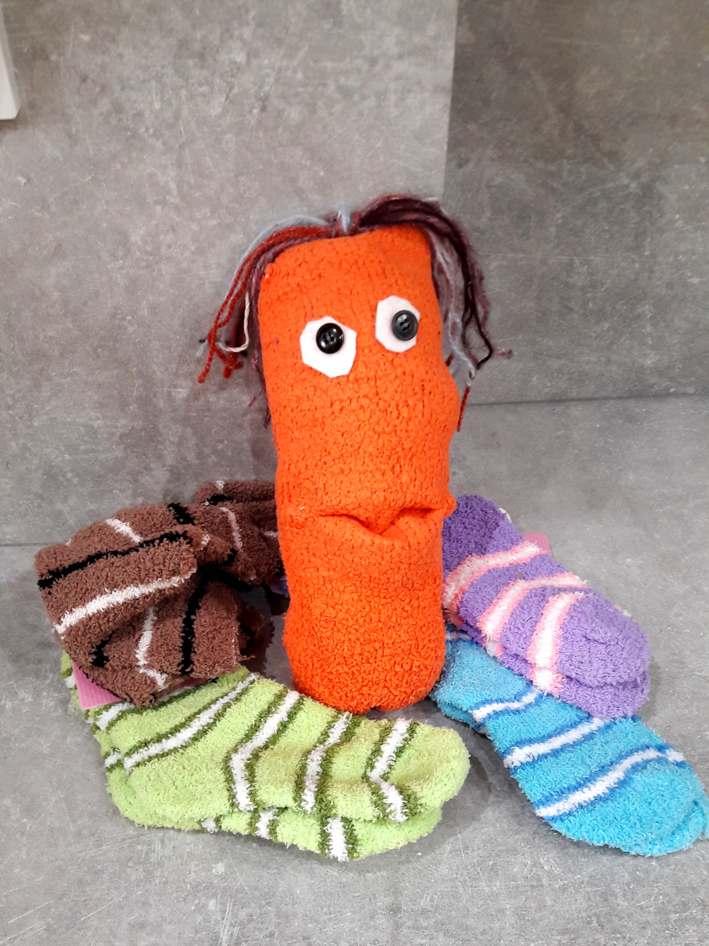 Všichni rádi plyšáky, ale takový plyšáček vlastnoručně vyrobený, to je věc! Přitom stačí koupit jen veselé barevné "ňuňací" ponožky (takové ty chlupatě hebounké), vycpat výplní do hraček, přišít očka, zvýraznit pusinku a zauzlovat vlásky.