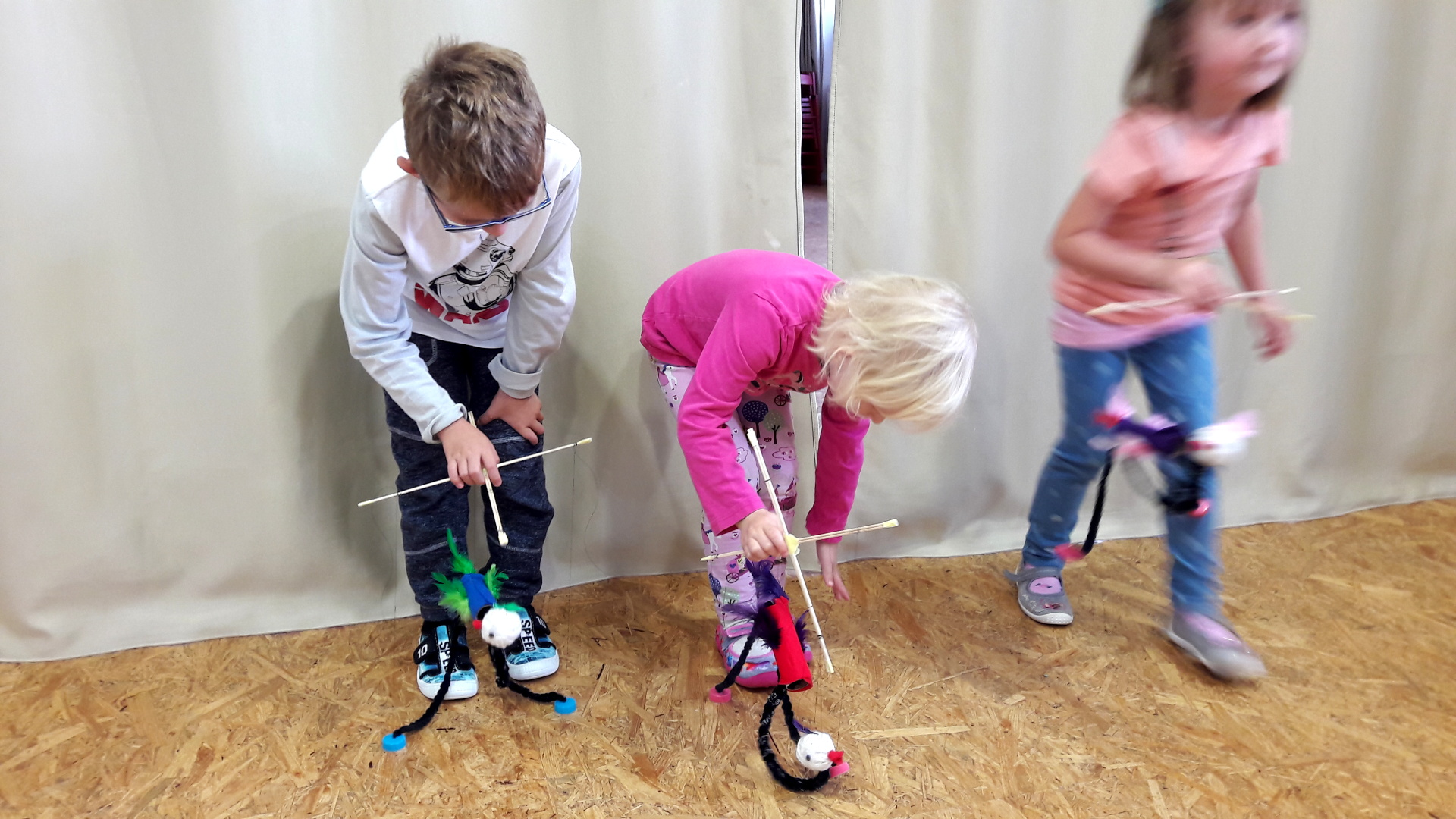 Však děti brzou přišly na to, jak se taková loutka vodí, aby správně ťapaly nožky a najednou naši pštrosíci pobíhali tak rychle, že nebylo možné je ani vyfotit. Hlídejte je, občas se jim úplně zamotají vodící nitky a nikdo neví proč. ;-)