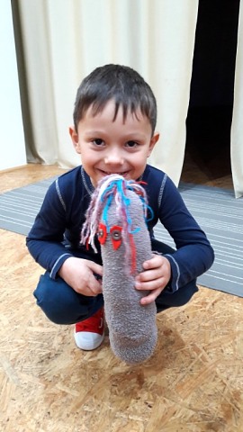 Připravila jsem dětem z tenkého textilií potaženého molitanu návleky na prstíky. Vyprávěli jsme si o divadle, jakou pohádku máme nejraději a pak jsme kreslili i vybarvovali fixkami na textil své maňásky.